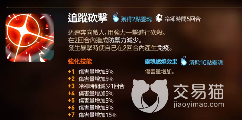 其中一技能可对敌人进行砍击,有一半的几率可减少对方的攻击,这个效果也会持续两个回合,若是发生暴击的话,伤害还会额外增加,这对于输出以及保护队友方面来说也是能起到一定作用的。