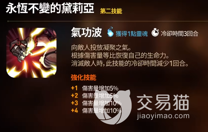 二技能是一个全体的输出技能,在造成伤害的同时也是兼顾了自身的生命恢复,此外在敌人被消灭时,还会减少该技能的冷却时间。