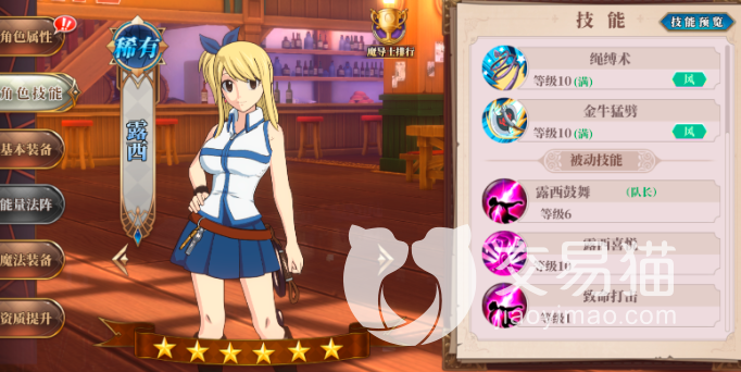 露西是在动漫妖精的尾巴中存在角色,游戏几乎完美复刻了露西在动漫里的形象和神态,就连技能都很还原,画面感十足,分分钟带小伙伴们走进妖尾的回忆。在妖精的尾巴激斗游戏中,露西是个适合很多团队的角色,技能都很实用,在前期的时候小伙伴们获得起来也很容易。