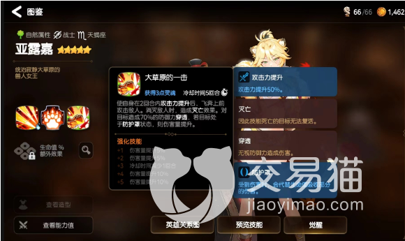 大草原的一击是亚露嘉的大招技能,这个技能使亚露嘉可以在两个回合之内都提高50%的攻击能力,并且这个大招是带位移效果的,直接飞向对手造成伤害的,这个技能如果直接ko敌人的情况下,那么敌人将无法重生,附带70%的穿透,如果对手有护盾,那么无疑亚露嘉会更加喜欢,因为这样大招的伤害更高了。