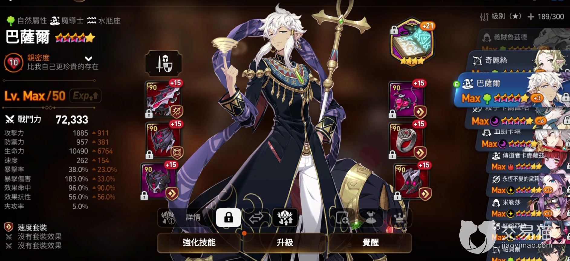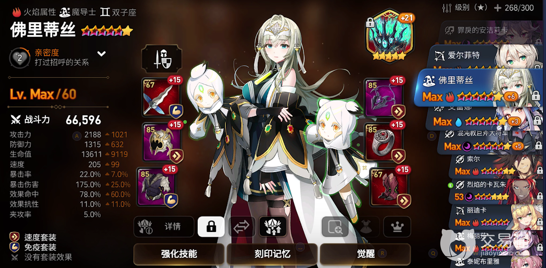该角色的速度优先级很高,对于速度装备的要求也相当严苛。是一旦速度装备提起来了,该角色在无论是PVP或者是pve方面都有着自己的用武之地。其普通技能就可以让非精英或者首领的敌人速攻值下降50%,而且该技能还会与其他相同名称的被动重叠使用,敌人使用非攻击技能的时候会可以反击攻击全体敌人,其效果还简易回合提升自己速度。