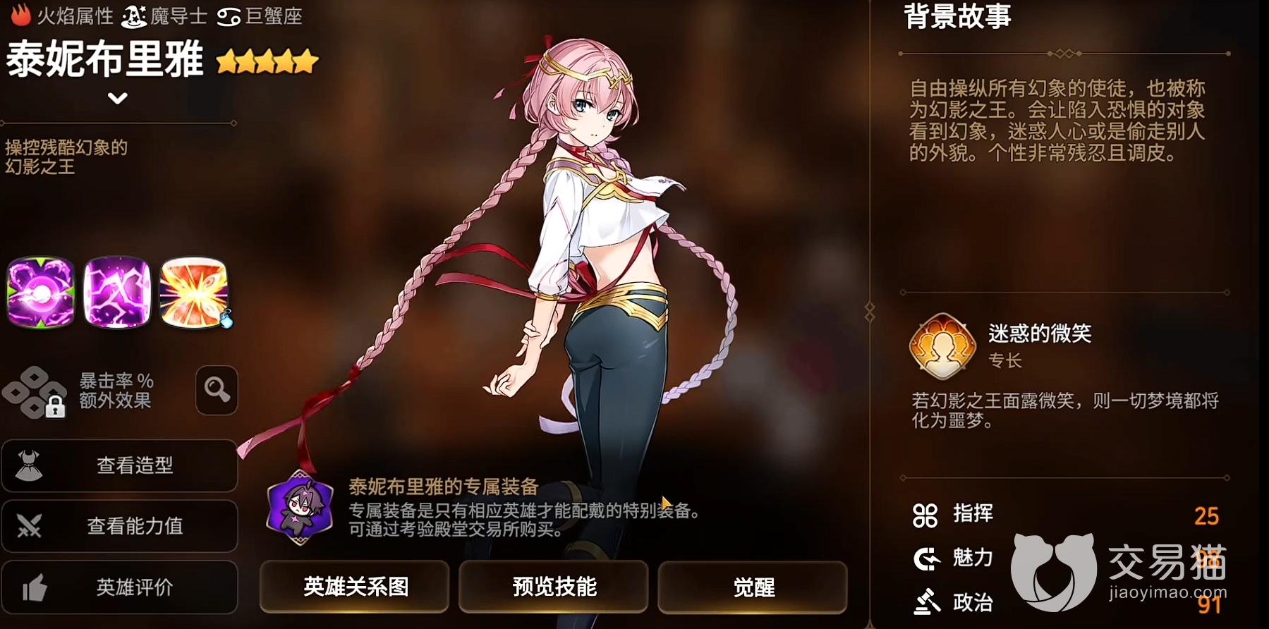 该角色作为一个限定英雄来说,出道即巅峰。是一个相当不错的控制类角色,可以说,很难有角色能够完全的反制她。其角色核心在于不断的折磨敌方,弱化能力优秀。只要在PVP当中触发角色技能效果的话,那么就会非常的强。