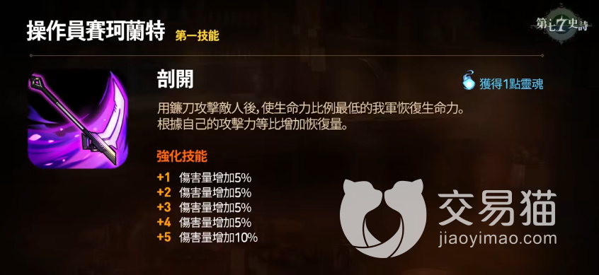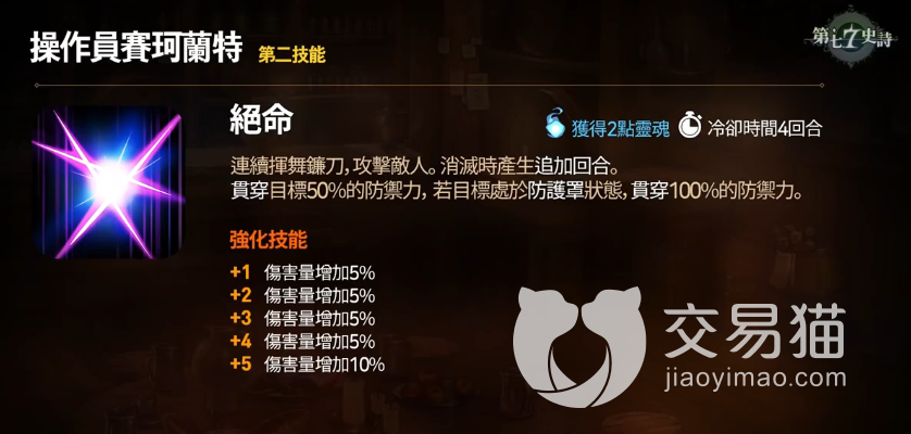 二技能“绝命”同样是单体伤害技能,并且此次伤害附带50%的穿甲效果,如果敌人身上有护盾,那么此效果提升至100%,此外,该技能击杀敌人后还会给予赛珂兰特额外的行动回合。