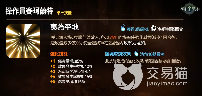 大招“夷为平地”是一个全体攻击技能,在造成大范围AOE伤害的同时还能减少敌人的强化回合和速攻值,此外也能增加友方两回合的攻击力!