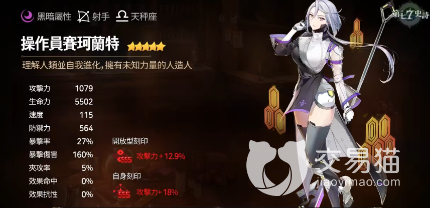 操作员赛珂兰特是由何蒙库鲁兹势力所研发出来的一个人造人,通过不断的冒险,她逐渐形成自己独特的人格,其实际强度非常出众,首先从属性面板来看,1079的攻击已经达到超一流水准,速度和防御属性也都达到中上游水平,唯一缺点就是血量少了些。