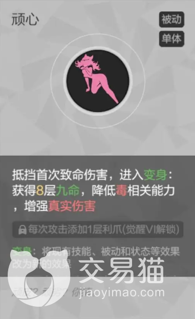 顽心:单体被动型技能,效果是受到致命伤害时抵消这次伤害,之后进入变身状态,该状态下可以直接获得八层九命效果,并且变身期间还会降低毒系相关的能力,但真实伤害都会得到加强,同时技能通过觉醒到第六阶段还能获得“每次攻击添加一层利爪”的效果,配合之前的九命可谓在攻防两段都得到了极致的增强!