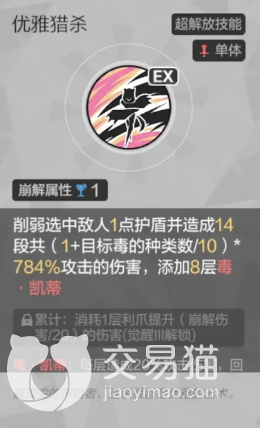 优雅猎杀:凯蒂的超解放技能,不过仅需一点崩解属性即可施放,它的效果是削弱单体敌人的一点护盾并造成784%攻击力的伤害,比较可惜的是这个伤害需要通过十四段打击才能打完,因此可能遭到各种减伤手段的反复削减,不过该技能除了伤害以外,还会添加八层“毒·凯蒂”!可以说该技能无论是伤害的加成还是debuff的添加都是十分惊人的,此外,通过三阶段的觉醒,还可以新增“根据利爪层数提升技能伤害”的效果!