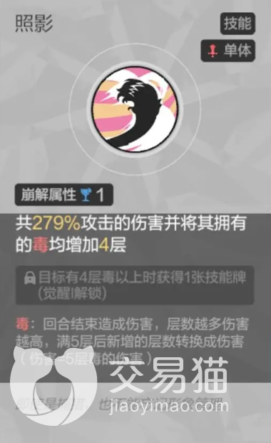 照影:主动型单体技能,需要消耗一点崩解属性,使用后可以对敌人造成279%的伤害,同时还可以将它身上的毒直接挂到四层,该技能的基础伤害就已经很高,后续挂的四层毒更是能源源不断的压低敌人血线,此外,通过一阶段的觉醒它还可以使凯蒂在挂毒的同时给自己新增一张技能牌,这样后续再打爆发可以更加连贯。