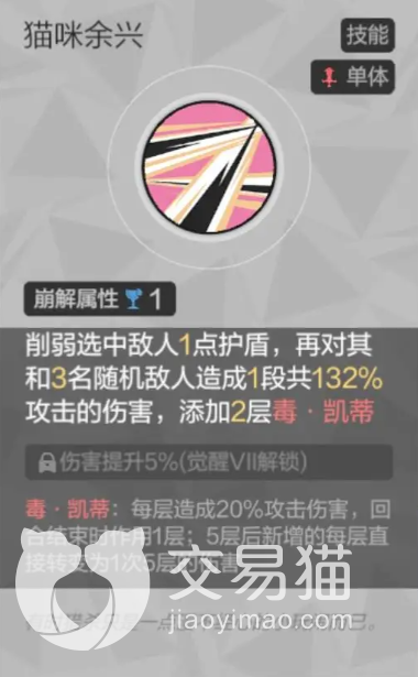 猫咪余兴:同样是需要消耗一点崩解属性的单体主动技能,使用后可以削减目标敌人一点护盾,并且还能对他和其他三名敌人造成132%的伤害,此伤害是一段式触发,不过会分摊到四个敌人身上,因此落到单体目标身上并不是很疼。但庆幸的是除了直接的伤害以外,它还会通过挂上“毒·凯蒂”的debuff来造成间接的持续伤害,这个伤害每层加成20%的攻击加成,五层之后更是能令新增的每一层都直接造成100%攻击力的伤害!