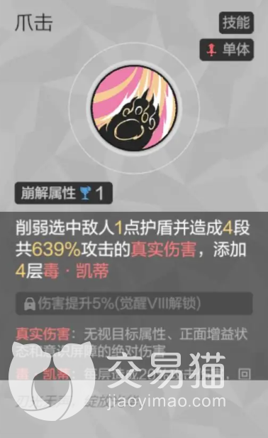 爪击:凯蒂的单体攻击技能,消耗一点崩解属性即可进行施放,可以削弱敌人一点护盾并造成4段共639%攻击的伤害,这个伤害的类型比较特殊,是可以直接无视敌人抗性的真实伤害,因此哪怕面对高防御的肉盾敌人它的威力也完全不会出现衰减。此外,该技能还可以在伤害打出后给敌人添加四层的“毒·凯蒂”效果,配合前面的“猫咪余兴”和“优雅猎杀”可以迅速将其叠满五层,从而提高单回合的中毒伤害。该技能同样是有觉醒收益的,不过需要到第八阶段才能解锁,解锁后会提升5%的伤害,这个比例应用在639%的伤害倍率上还是十分夸张的。