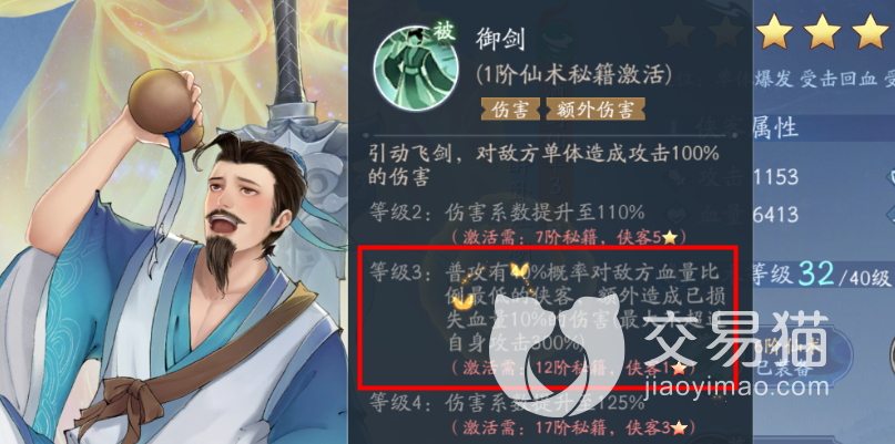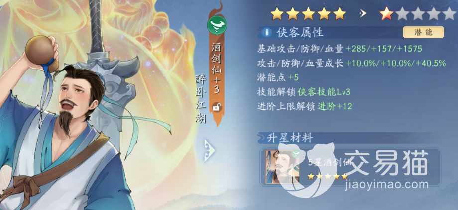 在探究具体加点之前有必要先了解酒剑仙的定位,看看他的技能效果是什么这样才好做出针对性的选择,酒剑仙是风属性的SSR侠客,定位单挑输出,有着不俗的爆发力。