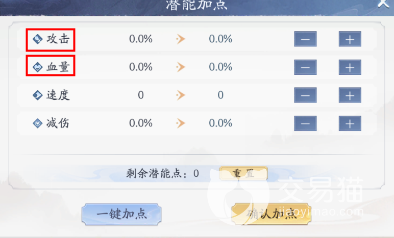 潜能加点可以在攻击、血量、速度、减伤这四个方面进行提升,速度不用点因为酒剑仙需要挨打来叠被动,并且血越少附加的伤害越高。推荐可以都堆攻击来打出更高的伤害,如果队伍里缺少承伤的也可以都堆血量,依靠着自身的高血量用大招来和敌人换血。