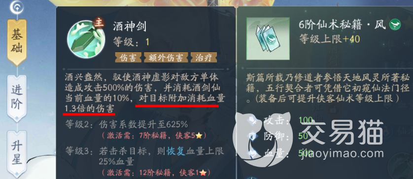 主动技能单体高倍率伤害,并消耗自身的血量来给敌人附加自身血量一定比例的伤害,消耗量最多为自身血量的15%,倍数最高为1.5倍,所以酒剑仙的单体伤害非常恐怖,可以通过堆血量的方式来提高伤害。