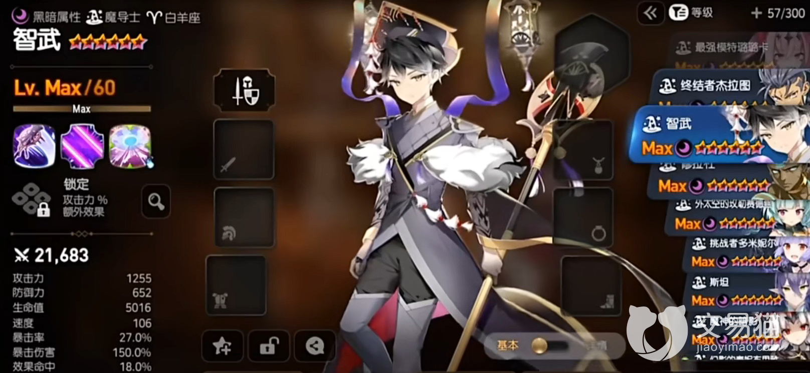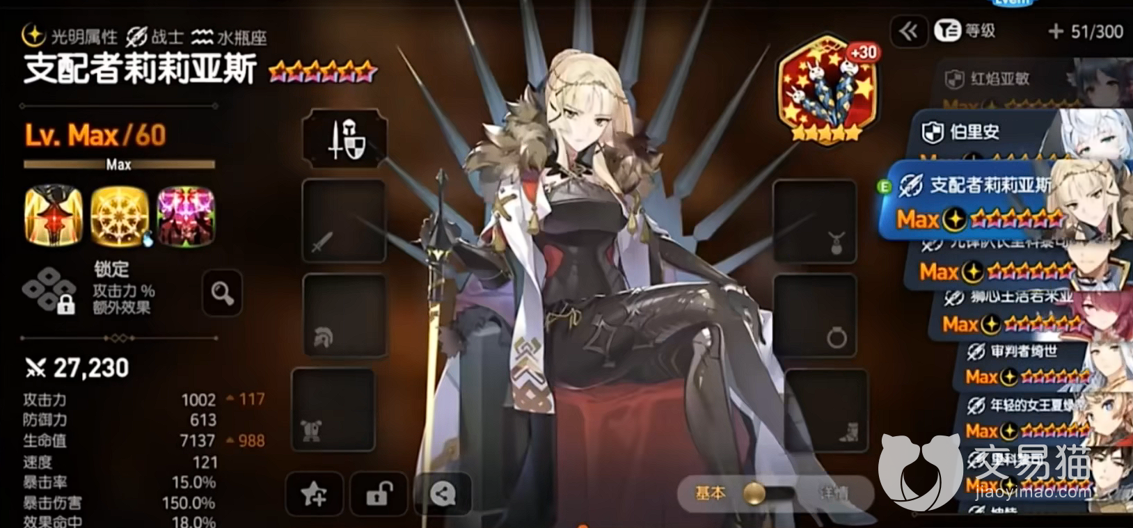 再搭配上首次战斗开始时提升的10%速攻的被动强化技能大权在握,以及大招俯首称臣。收敌人两个强化状态后进行攻击,一回合内造成沉默,并减少对面30%的速攻。并且使自己在三回合内获得神威效果,贯穿对面100%的防御力,不过不会发生暴击。是英雄的话,还要根据对面的生命力增加伤害量。可以说是集解除强化,暴击提升,速攻增加,防御贯穿为一体的顶级角色。