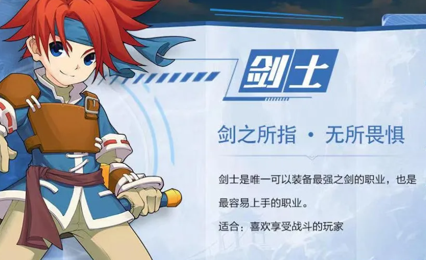 剑士:使用剑作为武器,是一个均衡的物理向的伤害类型职业,不仅兼具了输出与防御。还具备练级能力、单挑能力和生存能力,各项能力都是中等偏上,适合喜欢平衡型角色的玩家。
