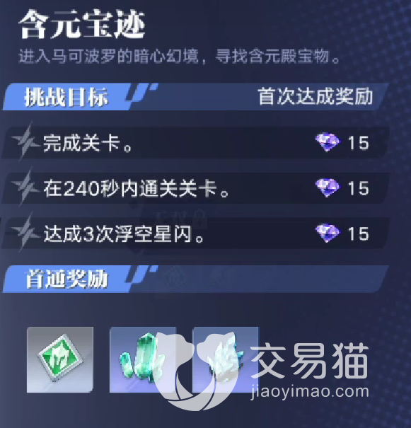 长安秘境这一条线在游戏中被分成了迷雾长安城以及含元宝迹这两个章节的故事,想要完整的通关长安秘境玩家们就得在这两个故事关卡中拿到三星。值得一提的是每一个关卡首胜的时候都可以根据完成的评价依次获得对应星级的宝石。每一颗星获得15宝石。这两个关卡一星任务是通关,二星则是在这个基础上于二百四十秒内通关,第三个则是达成三次浮空星闪。