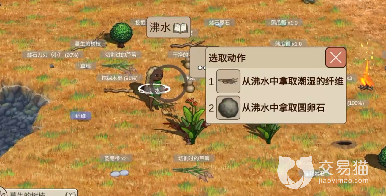 4、制作草绳:我们把切割的芦苇丢进沸水中烹饪,随后我们找到一个【蔓生的树枝】打捞芦苇,放在地上就会获得【纤维】;记住多准备芦苇,一个沸水坑只能煮一个芦苇;