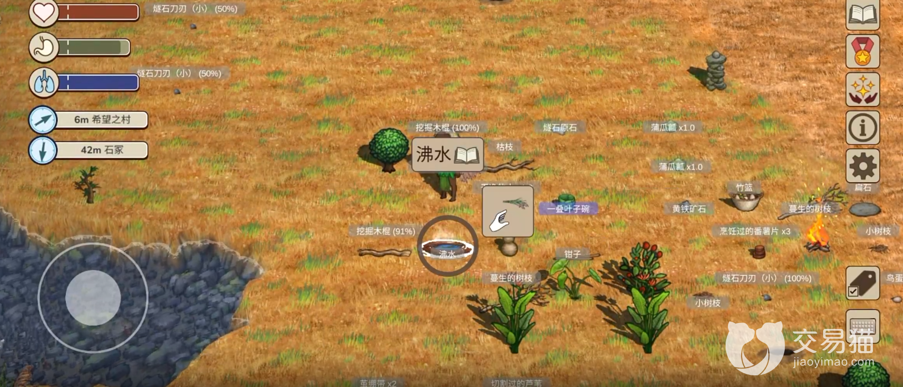 然后我们用【燧石刀刃】切割【枯枝】获得【挖掘工具】,在地上挖个【湿的坑】,然后用【葫芦】制作成水壶或者直接用【叶子碗】装【干净的水】(注意要在河里获得干净的水)备用;