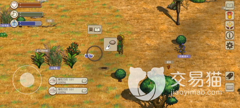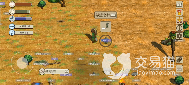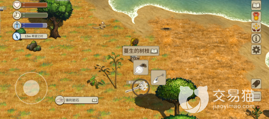 3、【柴】的打造就需要用到【锋利的岩石】,就是打造石冢的岩石,那种它去找一个地上的树枝,比如【枯枝】或者【蔓生的树枝】都可以,交互即可获得【柴】一份。