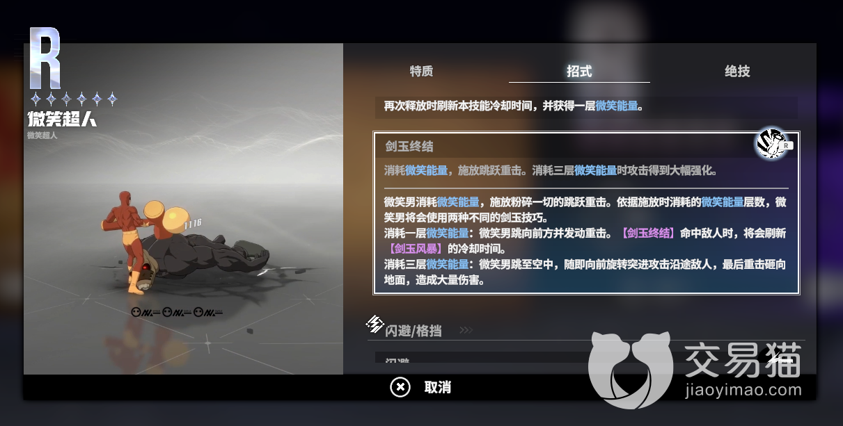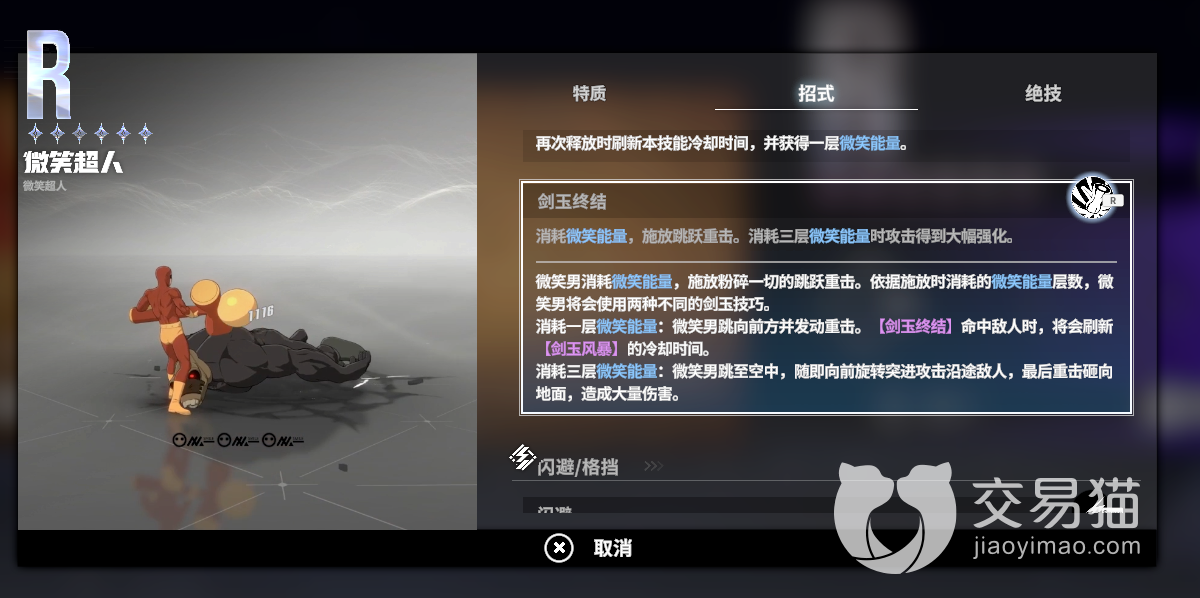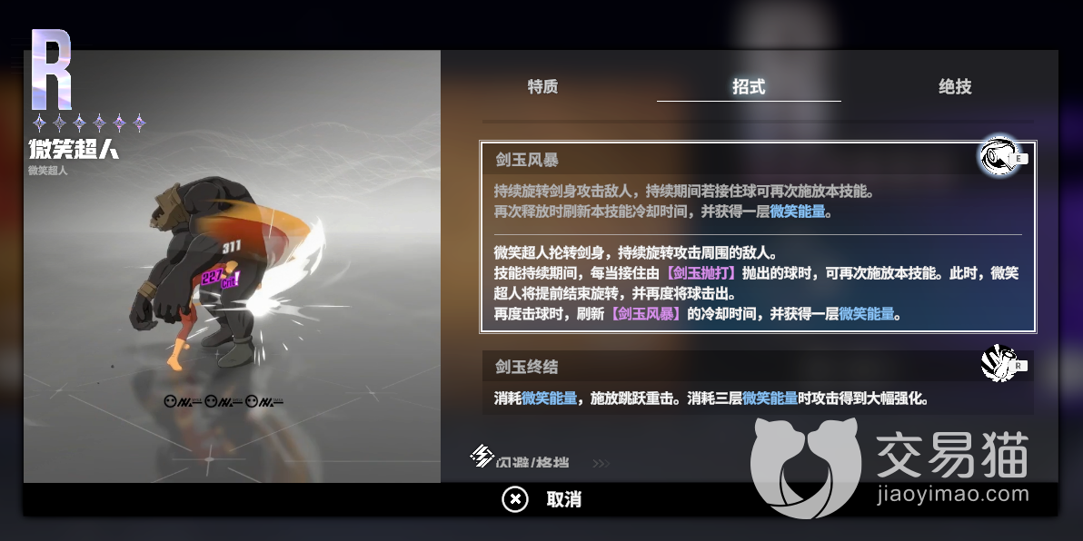 剑玉风暴:微笑超人开启大陀螺模式,对敌人造成持续性伤害。技能期间可以接球,接到球可以使用2段提前结束陀螺,并再次把球打出去,同时获得一层“微笑能量”,并重置该技能cd。剑玉终结:剑玉终结消耗全部“微笑能量”,造成高额伤害。1层以上时,重置e技能cd。这个角色的强度还不错,连招方面如果熟悉了会非常的容易上手。