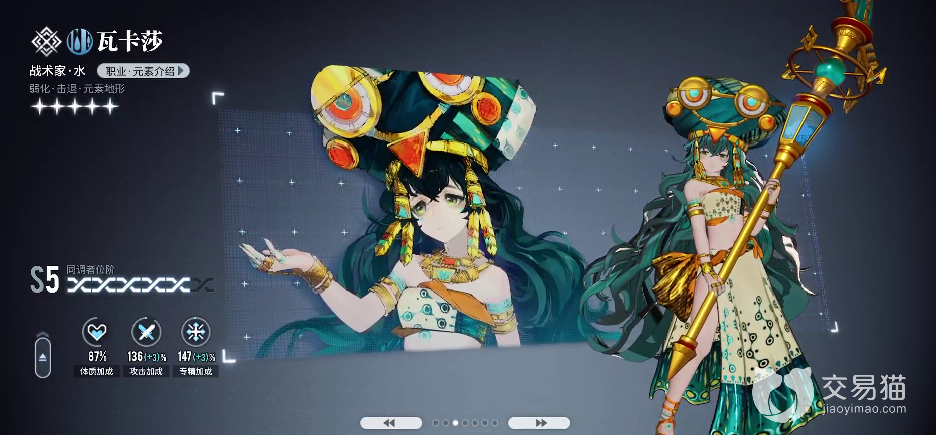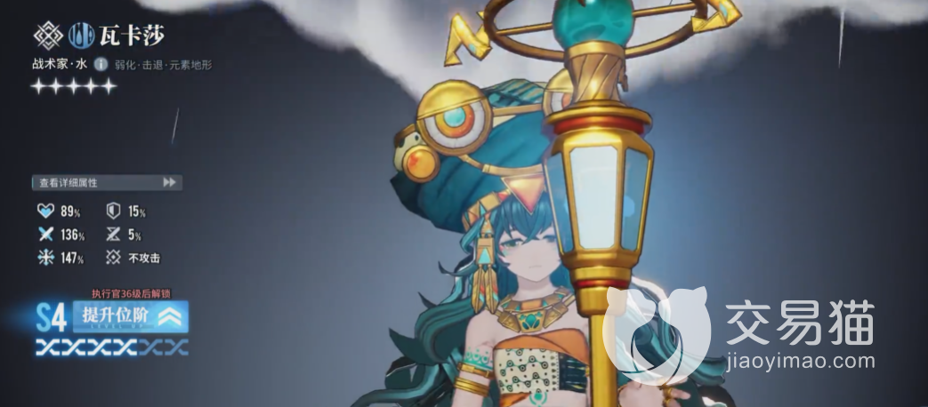 首先介绍一下瓦卡莎的基础信息,作为一个水属性的战术家。角色本身是不会主动进行攻击的,因此,这导致该角色的基础伤害方面加成不是很高,更多的是在于一些生命值以及专精方面的加成。此外,对于终端的初始属性较高。也较为符合作为一个战术家辅助的地位,毕竟你不能求她有多么高的伤害。