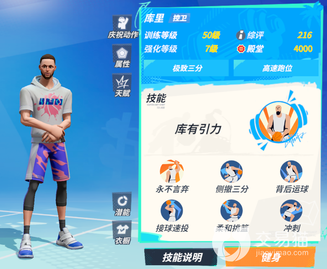 库里在游戏中所处的位置是控卫,之所以被称为巨星球员,肯定有不同于别的角色的独到之处,库里在游戏当中的进攻能力就是比较全面的,甚至可以说是全能选手了,妥妥的六边形战士,侧撤三分这个技能能够让库里在三分线附近游刃有余,背后运球这个技能又能够让库里轻松的突破对手的防守,再接上柔和挑篮这个技能直接上篮,进球得分就轻松到手了。