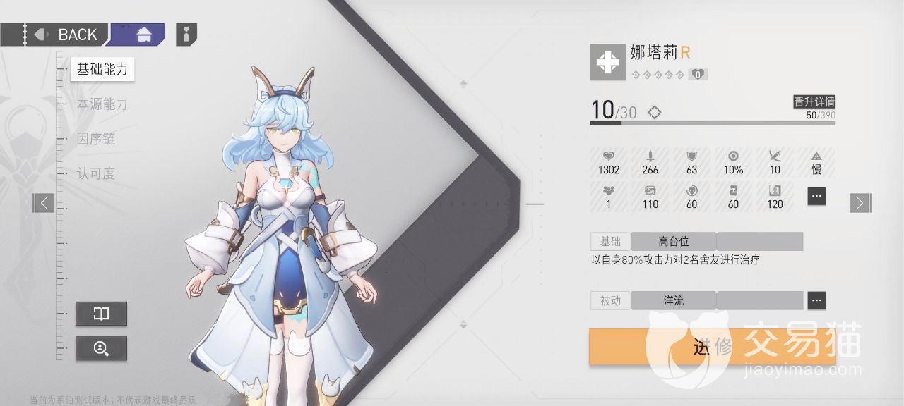 她是一个R级别的女性角色,水蓝色的头发,头顶还有一对耳朵,是一个治疗型角色,前期获得的概率非常的大,能够有效的对队友进行治疗。她站在高处,直接使用技能对周边的两名舍友进行治疗,可以有效的保护队友。