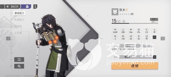 他是一名R级别的男性角色,在战斗中的定位是防御,是一个地面型角色,可以在靠近敌人的时候对敌人对敌人造成100%的物伤效果。当他15级的时候,生命值为2438,攻击为238,防御为246,他的生命值攻击以及防御会比上一个角色还要再高上一点,强度也相当不错。