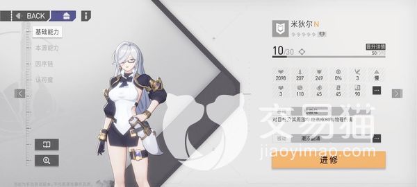 她是一个防御性的角色,拥有一头白色的长发,带着一个下半框式的眼镜,是一个n级别的女性角色,比较适合新手玩家使用,该角色的获取方法并不难,而且培养方面所需的材料也不会很多,在前期使用会比较节省资源,也能更好的发挥出强势效果。