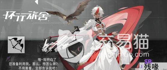 残喙在游戏当中是一个男生,黑黑的皮肤,但头发的颜色却是白的,人物的外形形成了鲜明的对比,另外还留着一缕红色的刘海,凸显的整个角色非常时尚。在游戏中残喙是一位拥有SR级别的角色,是非常稀有的。它的身后总是跟着一只老鹰,因为这个角色的定位是一个狙击狩猎者,所以在战斗的过程中带来的伤害非常高。