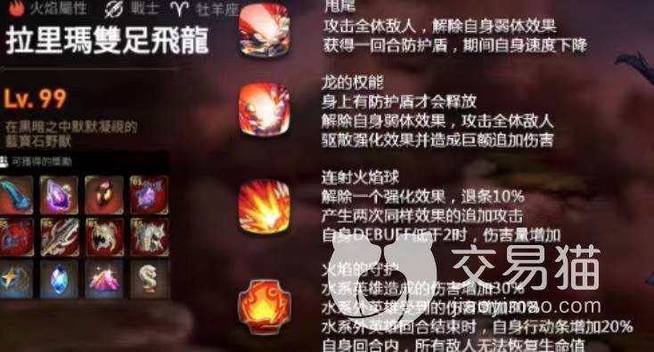 技能三火焰的守护,在对战的时候,火龙会对周围的敌人造成40%左右的火焰伤害火焰可以保护火龙不被敌人攻击,而且在回合结束前,敌人的自身行动也会受到限制,能够大幅度增加火龙存活的时间,对于水系角色来说造成的伤害会增加30%,就这一点来说,在阵容搭配上,玩家也需要切记不要搭配水系的角色来攻打火龙这个副本。