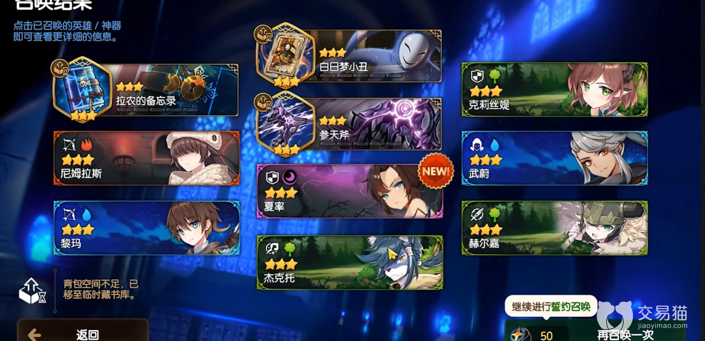 玩家在1-4关之后就可以进行筛选召唤了。玩家进行解锁后便可进行游戏中的首次抽卡。这里的抽卡中资源还是十分可以的,可以获得许多额外的奖励哟!如果能召唤到黛丝蒂娜和伊赛利亚会再好不过了,这两个角色在推图上都非常有优势,而且在游戏后期也是十分推荐的角色。玩家可以进行多次抽卡,直到抽到自己喜欢的角色为止哦!