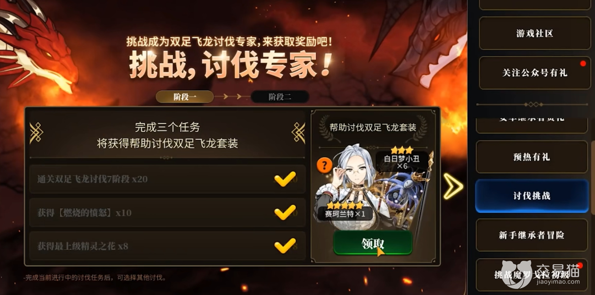 玩家达到第二大陆3-10后就可以到酒馆中,这里可以获得尤贝乌斯角色,这时玩家已经完成了前期的大部分任务和关卡了。玩家可以进行支线任务和剧情的解锁,在前期注意收集火讨伐战可能需要的材料,例如角色技能升级与装备等等。不仅如此,玩家还可以进行任务,这样可以快速提升游戏账号的等级。玩家获得讨伐专家任务中的赛柯兰特与酒馆中的安杰丽卡角色后,基本上完成了前期任务脱离新手村了。玩家接着可以进行龙13的刷取,可能会有点长并且无味,坚持下去你就成功了。