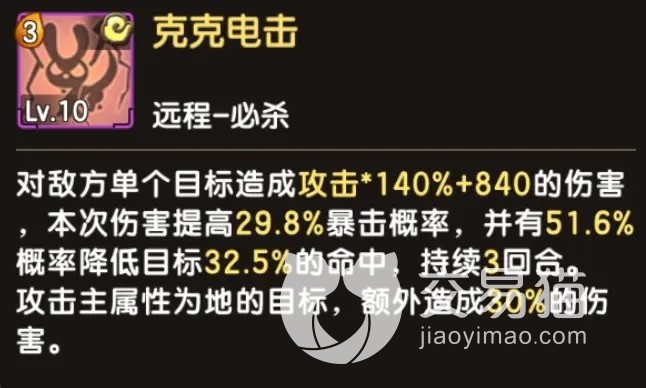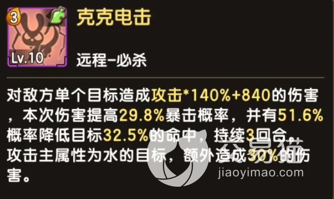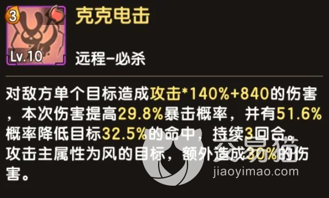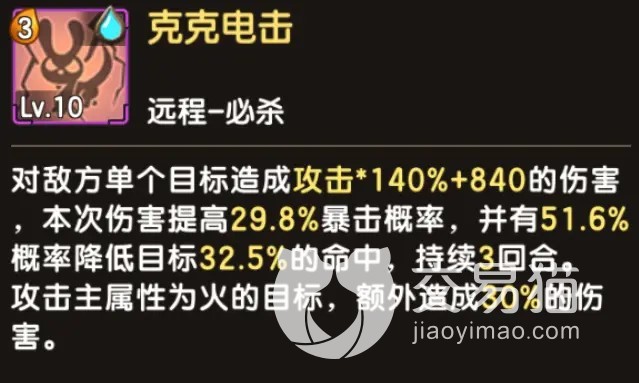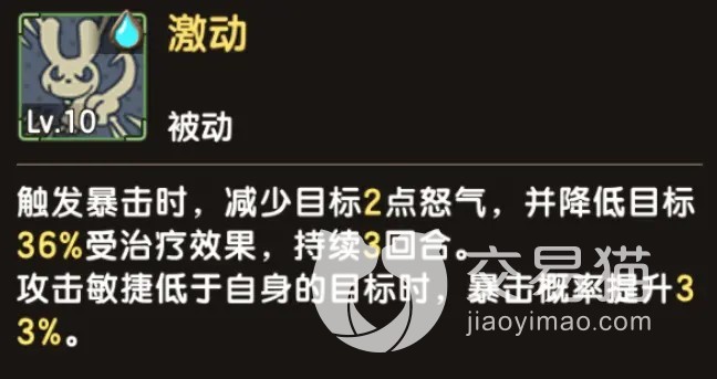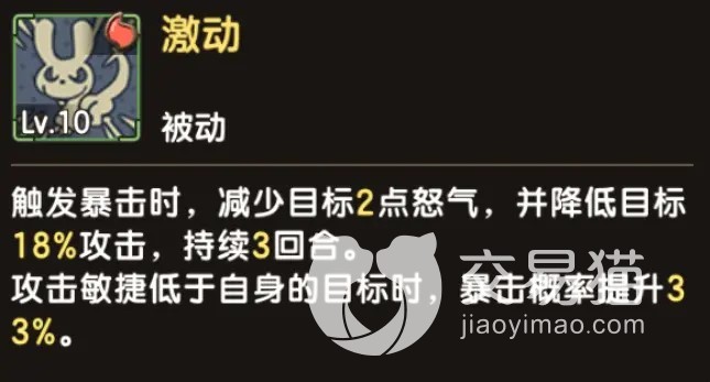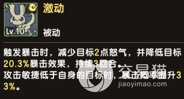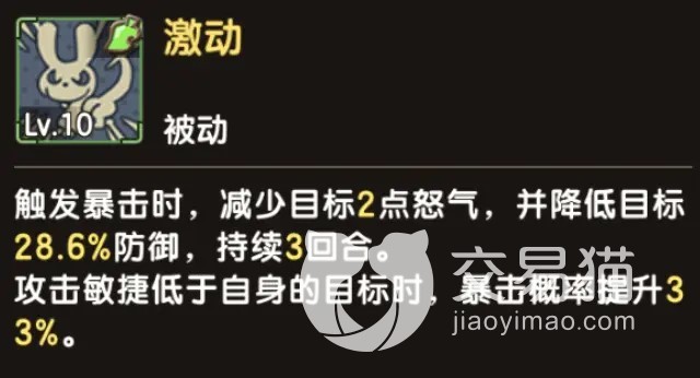 被动技能【激动】,触发暴击时,减少对方2点怒气值。如果敌方单体的敏捷值低于自身的话,还有概率提升暴击概率。火属性的额外降级敌方的攻击值;
