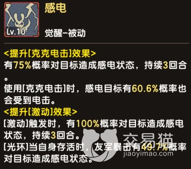 觉醒后技能【感电】,提升必杀技能。有概率对目标造成感电状态。在出发被动技能时可以给敌方造成感电状态,持续3个回合。