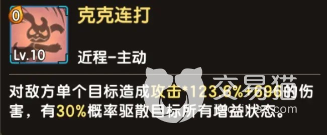 主动近战技能【克克连打】,对敌方单体目标造成伤害,有概率接触敌方所有增益效果的buff。