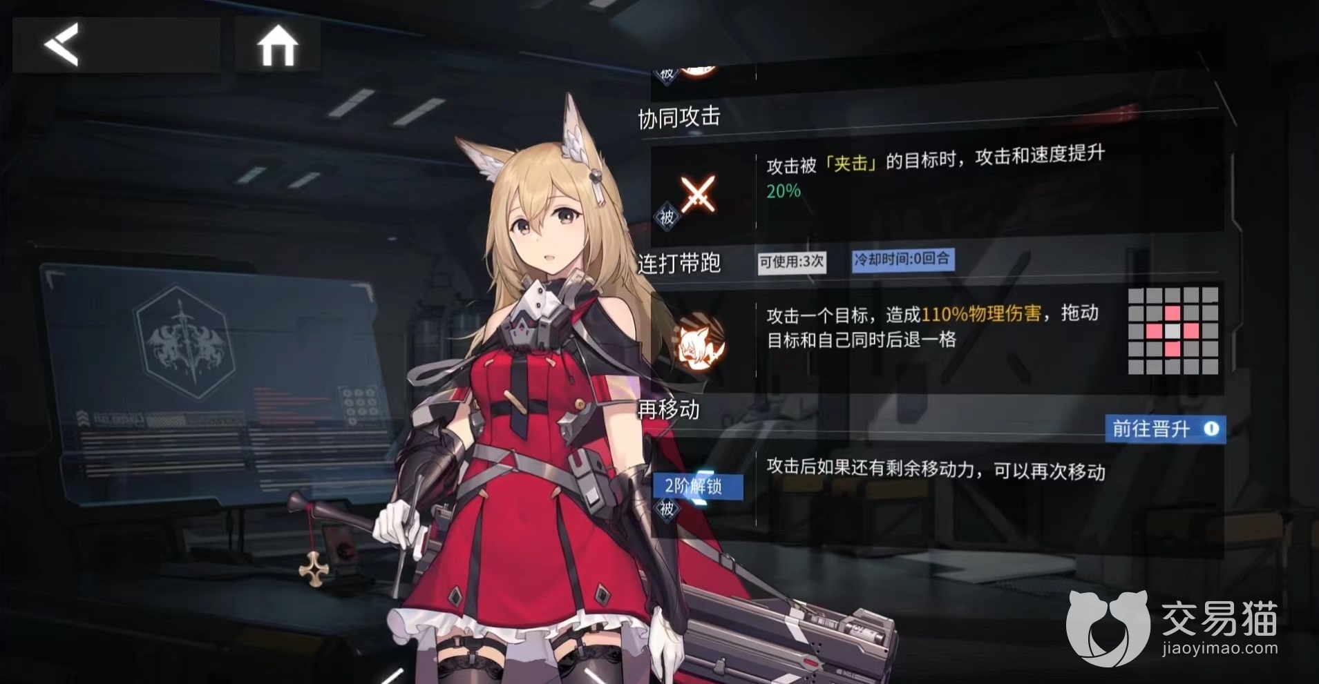 协同攻击为在攻击被夹击目标时攻击和速度都能提升20%。主动技能连打带跑,攻击一个目标造成较高的物理伤害,会拖动目标和自己同时后退一格。作为一名低星角色,伤害上肯定不会太乐观,但是能够移动目标和自己位置,在战斗中确实有着很好表现。尤其是在一些特殊环境战斗时,更是能起到绝佳效果。该技能没有冷却时间,最多可以使用三次,必须用在最能展现出效果的时刻。