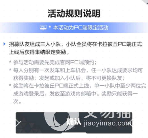 参与活动的话,需要完成PC端的预约,每个人都将有一次发车以及上车的机会。任意小队只要人数凑满三个人达成要求的话,就可以获得奖励。不过需要注意的是,在发起小队或者加入别人发起的小队之后,将不可以更换队友,因此,建议要一些日后可以组队一起游玩的朋友们加入。