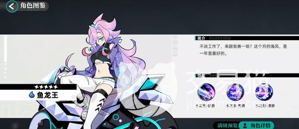 她在这个游戏中是一个五星水属性的角色,在游戏中的强度非常高,要说水属性角色谁最厉害,那鱼龙王必是但这无愧的第一。她的一技能可以将敌人的一个强化状态直接转到自家队友身上,要是转换成功的话,该强化状态会延长两个回合,不过该技能它的概率并不高,只有50%,所以建议大家在游戏中的时候不要去赌,很容易翻车哦。