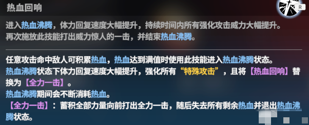 在琦玉和敌人战斗的过程中,会积累一个叫做热血值的东西,当热血值达到一定数量后就可以开启热血回响,这时会进入热血沸腾状态,热血沸腾的效果主要有三个,分别是提升体力恢复速度,强化特殊攻击和发动全力一击,其中前两项的效果非常明显。
