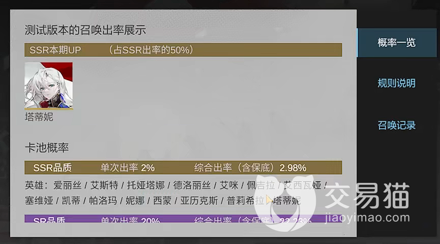 抽卡几率方面,SSR的出货率为单次出率2%,SR为20%,R卡为78%。50抽之后,每一抽额外提高5%,直到70抽达到100%。同时,限定up池子第二次保底必得。就是我们常说中的小保底和大保底,不过实际体验下,保底所需的抽卡次数要少一些。