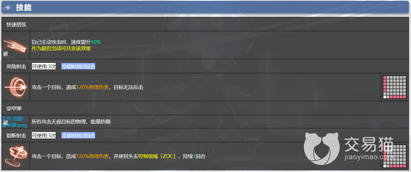 死角射击:可使用3次,冷却时间0回合,攻击一个目标,造成120%物理伤害,目标无法反击。这个技能可以让罗宾安全地攻击敌方的远程单位,不用担心被反击,而且伤害还不错。其实罗宾的死角射击和阻断射击技能都可以对敌方造成控制效果,让敌方无法反击或者失去ZOC。这样她就可以打断敌方的进攻或者撤退计划,给我方创造更多的机会。