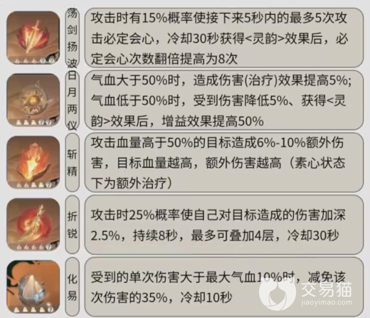 首先的内功推荐是除了素问以外的其他所有职业都可以使用和参考的内功模板,由荡剑扬波,日月两仪,斩精,折锐,化易组成。后期成型后三火三土,不仅兼顾了本身自身的一定坦度,还能保证了一定的输出能力,攻防兼备。前期阶段的话,可以尽量保证心法能够凑齐三火两土,以应对需要大量输出的pve环境,之后再根据需要凑满其他的心法即可。