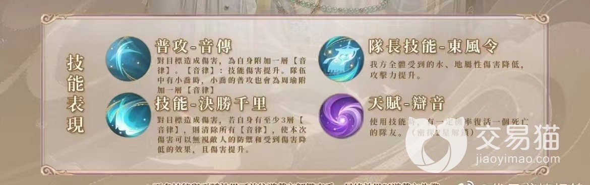 下面介绍一下周瑜的技能表现,普攻叫做音傅,对目标产生伤害,为自身增加一层【音律】,他的技能决胜千里,不仅可以对目标产生伤害,如果自身有3层或3成以上的【音律】,即会清除所有的【音律】,并且可以使该次伤害可以无视敌人的防御同时降低受到伤害的效果,且伤害提升;周瑜的队长技能东风令可以使我方全体受到的水、地属性伤害降低,攻击力提升;周瑜的天赋叫做辩音,使用时,有一定概略可以复活一个死亡的队友。