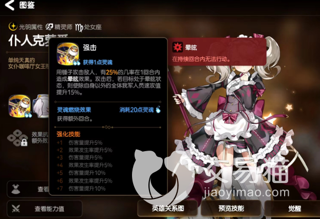 仆人克萝爱(光):光属精灵释放,这种攻击速度比较快,能够对对方造成眩晕效果,如果眩晕效果比较明显,那么就可以提升自己和队友的攻击速度值。当群体抗性提升后,每回合开始会给己方血量最低的成员恢复生命值。光锤血量最大的恢复的也是快,血量最小的则恢复的比较慢,而那些非死亡的队友,可以驱散两个负面效果,并且在三回合后提升全体成员的攻击力。有攻击buff,群体驱散效果很不错,还包含复活等技能。对此冷却时间会比较强一些,但是效果绝对是杠杠的。