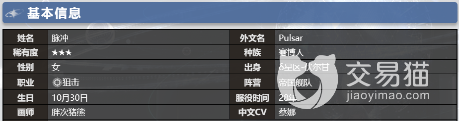 脉冲是一位来自伏尔甘的狙击特勤人员,她是一个旧型号的赛博人,但是她努力超越自我,为了团队倾尽全力。她的稀有度是三星,种族是赛博人,性别是女,阵营是帝国舰队。她的生日是10月30日,服役时间是28年。她的画师是胖次猪熊,中文CV是蔡娜。而脉冲作为一名狙击手,她的优势在于远程输出和穿透防御。她可以利用极限狙击来打击敌方后排或者难以靠近的目标,造成高额伤害。而穿甲弹则可以让她无视敌方的防御力,对抗高防御或者有护盾的敌人。专注则可以提高她的暴击率,增加输出稳定性和爆发力。