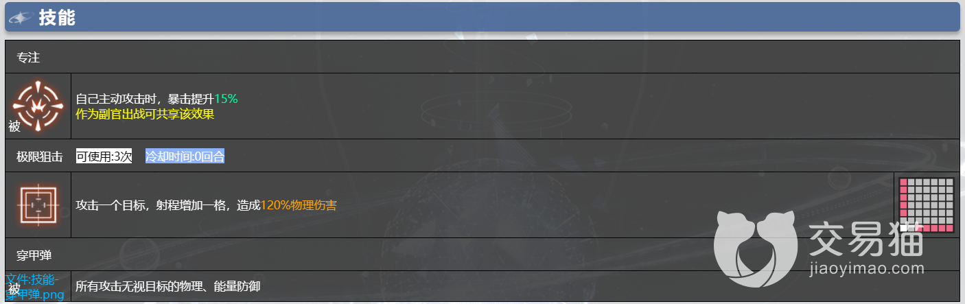 脉冲的技能分为主动技能和被动技能,主动技能需要消耗行动点数(AP)才能使用,被动技能则是在特定条件下自动触发的效果。脉冲的主动技能有两个,分别是:极限狙击:攻击一个目标,射程增加一格,造成120%物理伤害。可使用3次(天赋可增加)。而值得注意的是,脉冲的极限狙击次数有限,因此需要根据战局选择合适的时机和目标使用,避免浪费或者留到最后无法发挥作用。穿甲弹:所有攻击无视目标的物理、能量防御。脉冲的穿甲弹可以无视敌方防御力,但是不能无视敌方抗性或者其他减伤效果。因此,在面对有抗性或者减伤效果的敌人时,需要考虑是否有更好的输出选择。