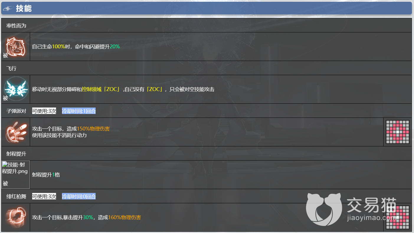 “飞行”:移动时无视部分障碍和控制领域(ZOC),自己没有ZOC,只会被对空技能攻击。这个技能可以让“琉火”在地形上更加自由,不受敌人的限制,同时也可以避免一些对地面特勤有效的攻击。十分适合搭配移动力+1这个天赋,它能提高“琉火”的移动范围,让她可以更快地接近或远离敌人。