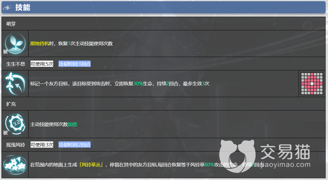 摇曳风铃:在范围内的地面上若干格子的自建草丛,停留在其中的友方目标,每回合恢复等于风铃草80%攻击的生命,持续2回合。这个技能可以为友方目标提供持续的治疗效果,同时也能阻碍敌人的移动和视野。玩法介绍及攻略:这个技能可以让风铃草在战场上创造出一个治疗区域,让停留在其中的友方目标每回合都能恢复生命值,从而增加他们的持久战斗力。