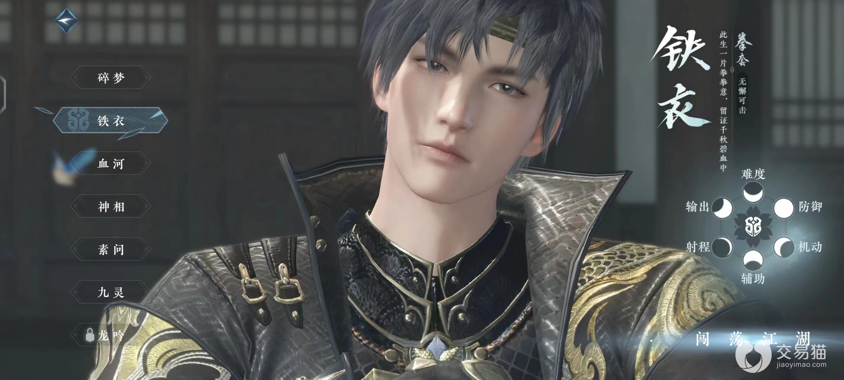 铁衣:游戏内坦度最高的一个职业,不论是基础的防御和气血属性,还是技能构成都能够很好的承担起队伍抗伤的人物,在刷本的时候尤为好用,不论前中后期都是被队友抢着组队的存在,而且也无需担心它会被敌人当做笨重的沙包,因为其技能间隙不长,而且有盾有控,同时还有一手突进能力,可以有效的避免被风筝。